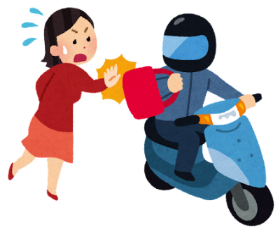 人気のない通りや、暗い道でバイクなどで近づき、追い抜きざまにハンドバックや手荷物を強引に盗っていくため、被害者はケガをしてしまうこともあってとても危険です。